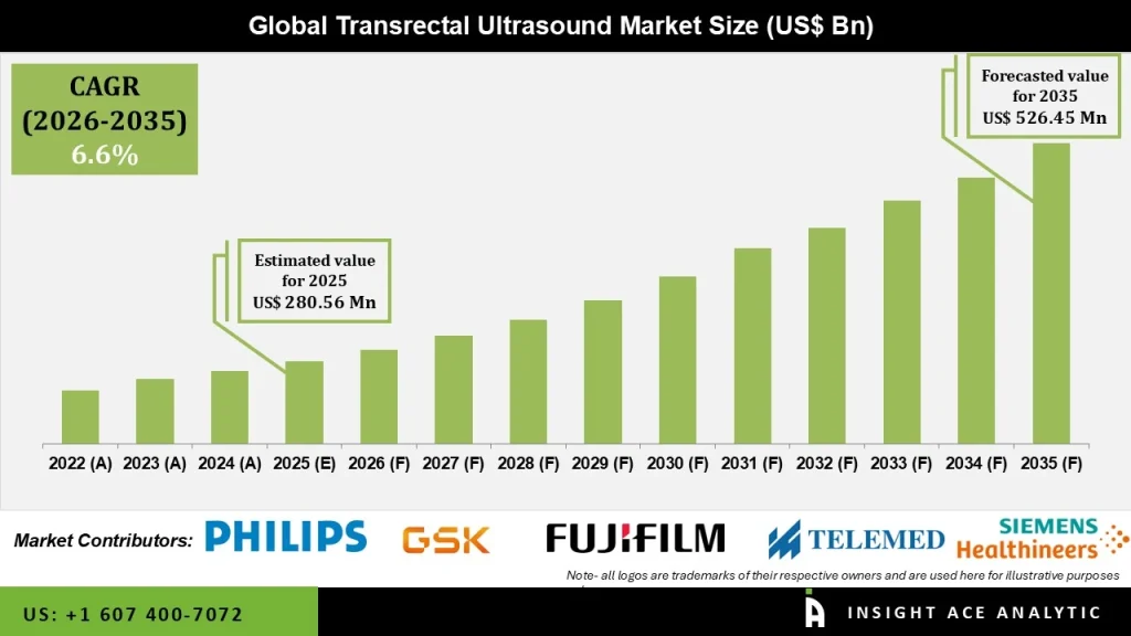 Transrectal Ultrasound Market Size is valued at USD 280.56 Mn in 2025 and is predicted to reach USD 526.45 Mn by the year 2035 at a 6.6% CAGR during the forecast period for 2026 to 2035.